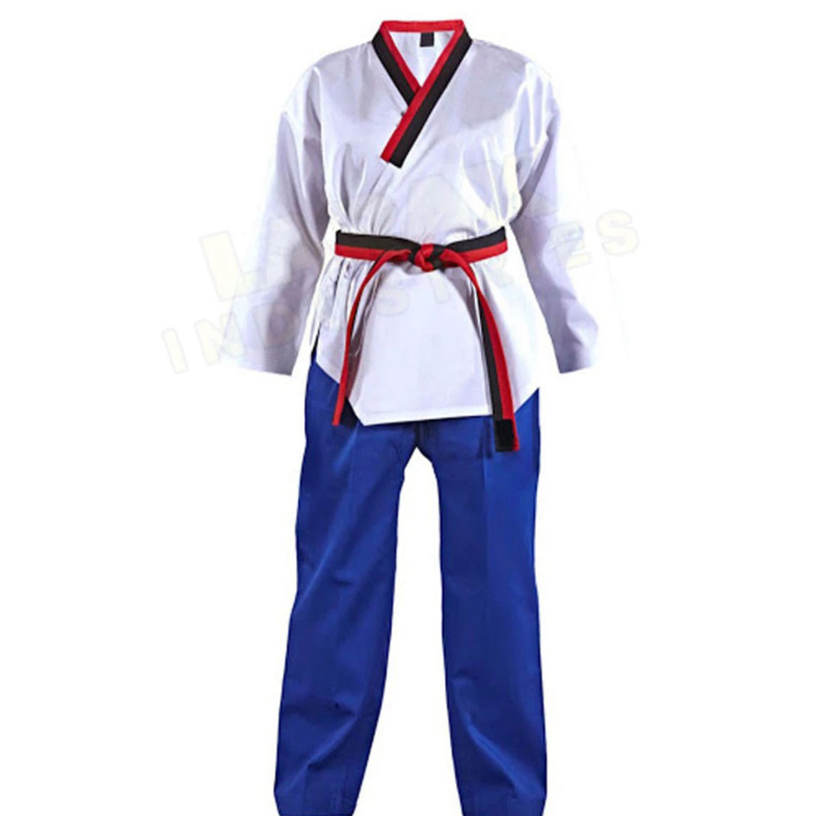 Our very popular and fashionable WHITE STUDENT TAEKWONDO UNIFORM POOM V-NECK. Manufactured with a specially designed combination poly/cotton fabric which is lightweight, flexible and soft, while providing the strength and durability to withstand even the toughest and most seasoned of martial artists. The jacket is designed with a very fashionable black and red lapel, so you can be the coolest person at your gym, even when you're just standing around after your training session is over. The pants are manufactured for maximum flexibility, durability and comfort also, as they are made from the same durable, yet comfortable poly/ cotton material which the jacket is made of, but they also come with an elastic waistband, which has an adjustable drawstring, to provide the exact tension each individual prefers. One order includes a lightweight, 7oz. jacket with black and red lapel and pants. Belt not included